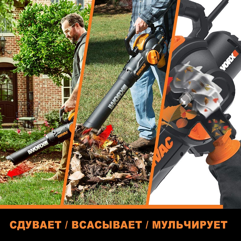 Если же вам необходимо не только согнать листья и сор в угол участка, но собрать их и в дальнейшем утилизировать, в такой ситуации не обойтись без обладающего более расширенным функционалом садового пылесоса WORX. Садовый пылесос с функцией мульчирования – аналог воздуходувки, позволяющий не только сдувать листья и сор с дорожек и газона, но и собирать в специальный мешок и измельчать собранный садовый мусор.