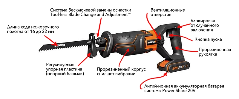 Далее рассмотрим подробнее некоторые принципиальные различия сабельных пил WORX.